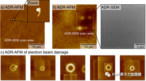 此外,图c通过总结高能电子束对样品表面造成的变化示例,突出了电子束对晶片造成损坏的风险。ADR-SEM 扫描区域可以在 ADR-AFM图像中识别为缺陷周围的矩形。