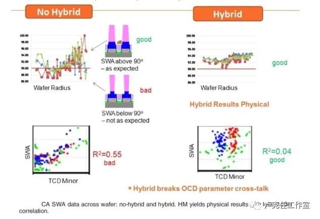 图中的仿真模拟算法描述了量测对象及虚拟混合量测生态系统,为我们显示了混合量测技术的引入是如何解耦两个几何参数 SWA 和 TCD 的,对比这两个参数在没有混合量测技术的情况下是如何以非物理方式耦合的。