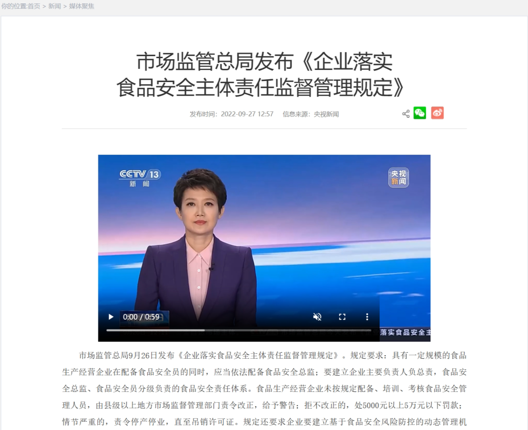 值得一提的是,自2022年11月1日起,《企业落实食品安全主体责任监督管理规定》(国家市场监督管理总局令第60号)正式实施。《规定》明确企业的食品安全机构、食品安全总监、食品安全员等要依法落实食品安全责任行为,使企业食品安全有人管,责任落实有抓手,确保食品安全主体责任落到实处。