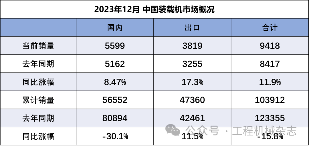 2023年1-12月,共销售各类装载机103912台,同比下降15.8%。其中国内市场销量56552台,同比下降30.1%;出口销量47360台,同比增长11.5%。