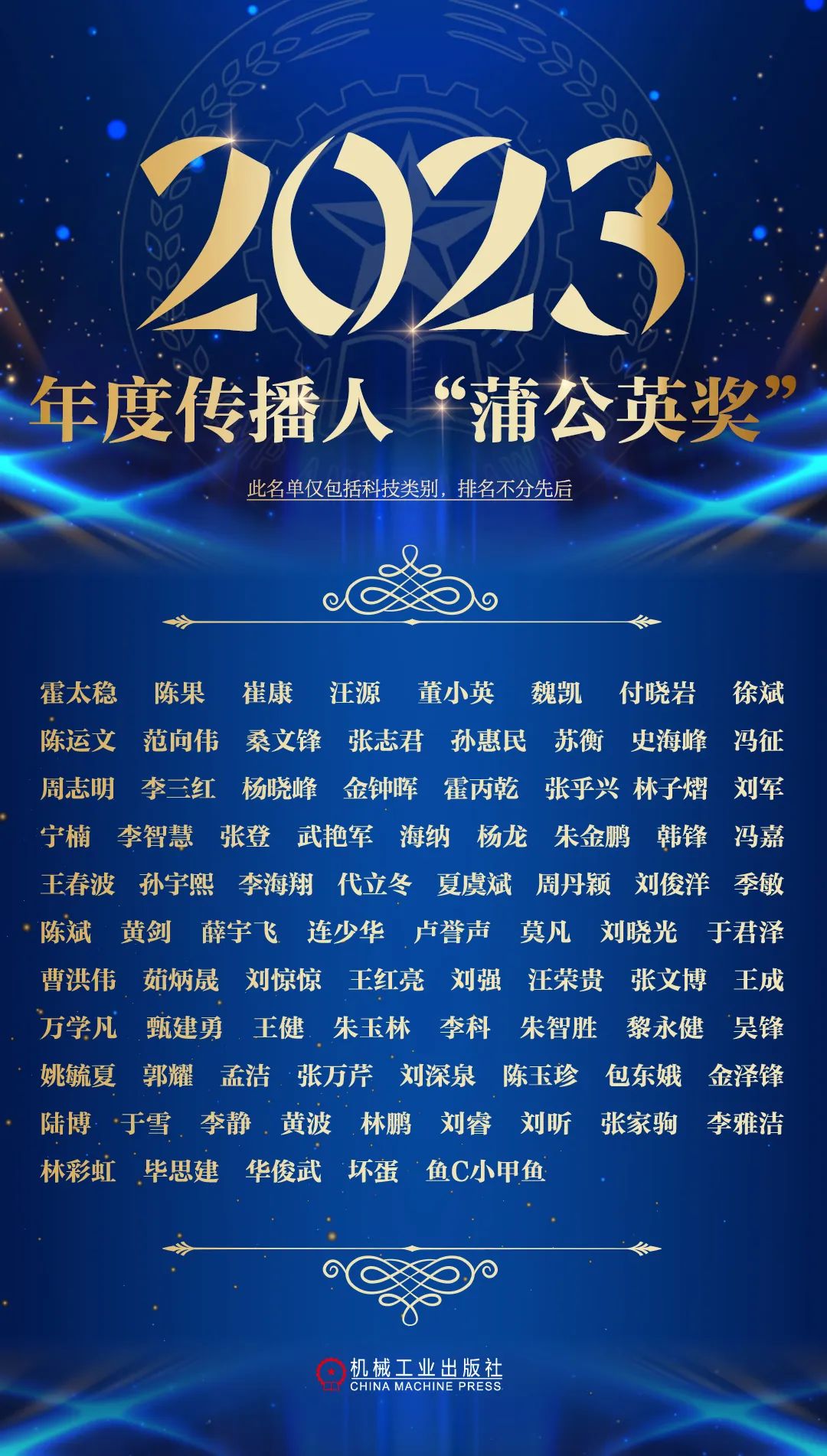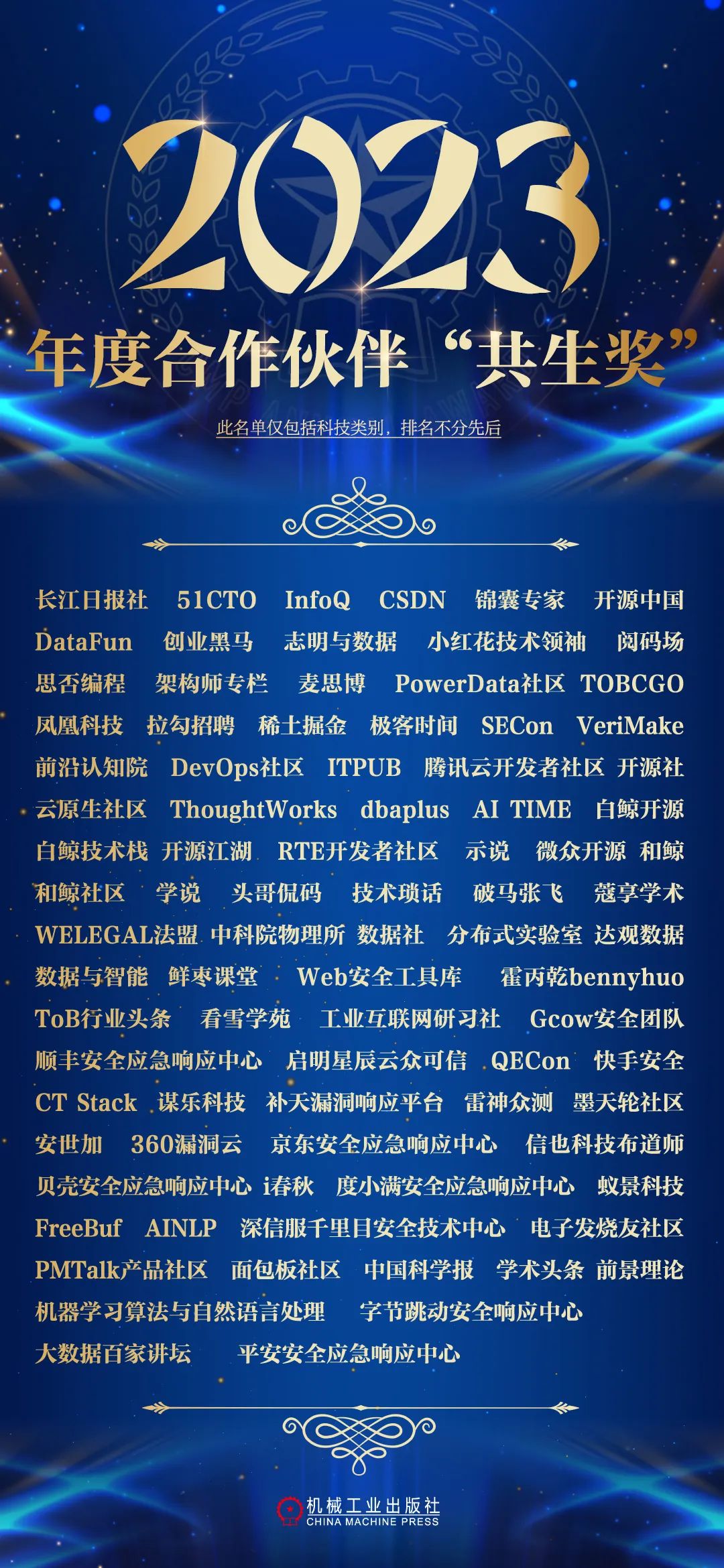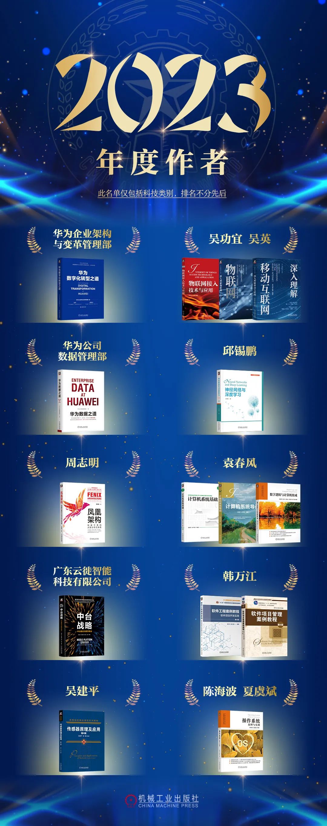 2023年又是有丰富的科技好书伴我们度过的一年。辞旧迎新之际,机械工业出版社华章分社科技领域“2023年度作者”奖项重磅出炉,藉此表达我们对卓越作者们的敬意,感谢你们2023年里在各领域产出的顶级优质作品。此外,2023年度合作伙伴“共生奖”和2023年度传播人“蒲公英奖”同时揭晓,感谢获奖的机构和个人为知识和优秀思想像蒲公英一样乘风远行所付出的努力。