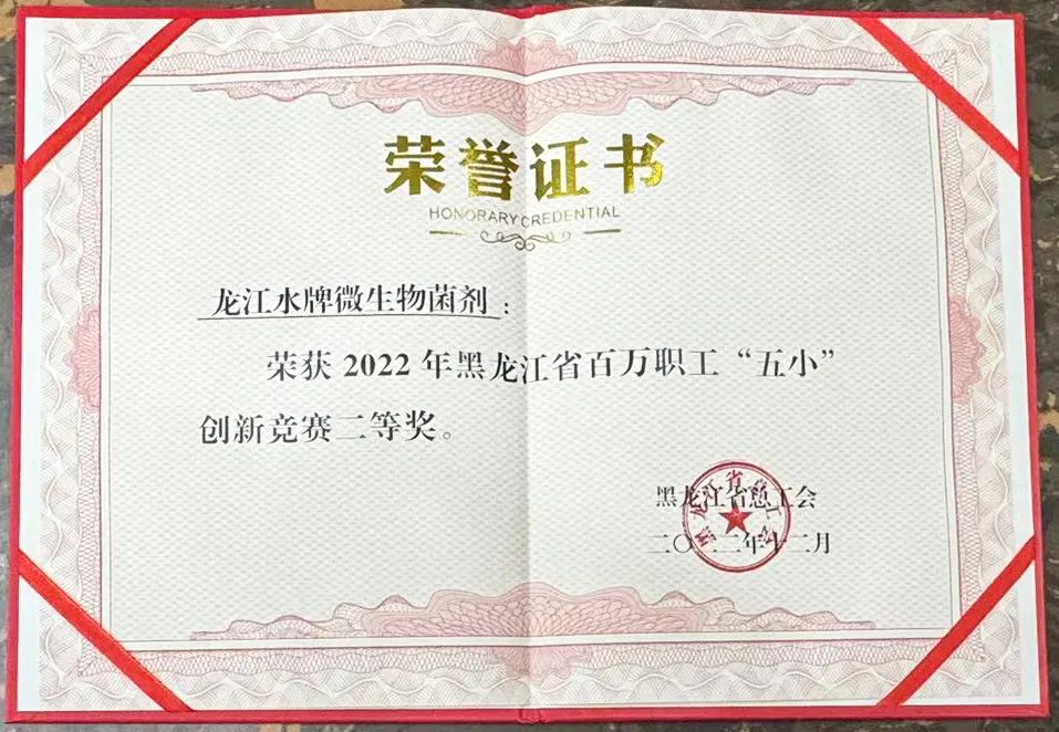 为全面贯彻党的二十大精神,深入推进新时代产业工人队伍建设,在全省培养造就一支有理想守信念、懂技术会创新、敢担当讲奉献的职工队伍。黑龙江省总工会在全省开展了2022年黑龙江省百万职工“五小”创新竞赛,黑龙江省食品行业工会联合会向上级工会推荐的行业会员企业黑龙江省耕食利农业科技有限公司的成果(龙江水牌微生物菌剂)获得黑龙江省百万职工“五小”创新竞赛二等奖。