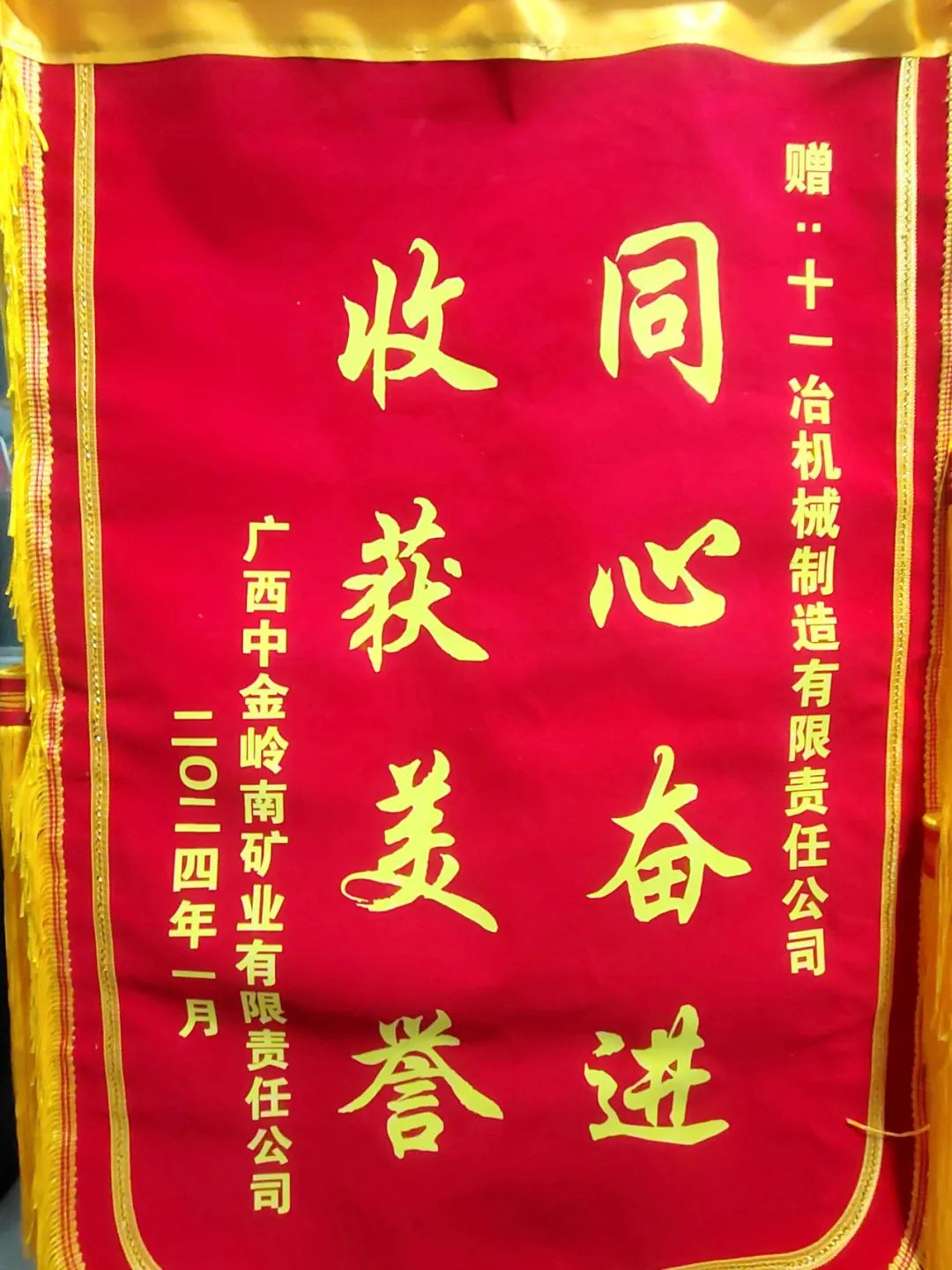 2024年1月12日,中金岭南项目相关负责人专程来到柳州,将两面分别绣有“同心奋进 收获美誉”和“精心组织 卓越管理 彰显施工标兵风采”的锦旗致以机械制造公司,对机械制造公司在项目建设过程中的专业素养及务实作风表示充分肯定和高度赞誉。