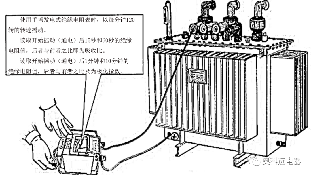 测量绕组连同套管一起的绝缘电阻、吸收比和极化指数,对检查变压器整体的绝缘状况具有较高的灵敏度,能有效地检查出变压器绝缘整体受潮、部件表面受潮或脏污以及贯穿性的集中缺陷。例如,各种贯穿性短路、瓷件破裂、引线接壳、器身内有铜线搭桥等现象引起的半贯通性或金属性短路。经验表明,变压器绝缘在干燥前后绝缘电阻的变化倍数比介质损失角正切值变化倍数大得多。