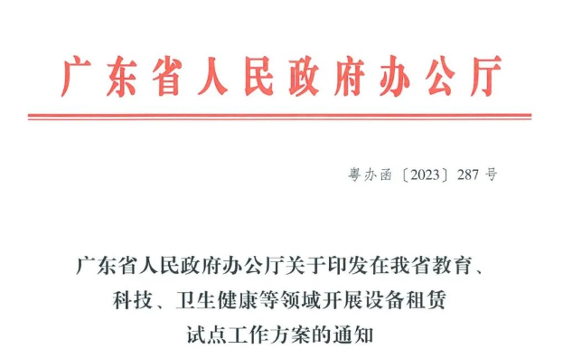 近日,广东省政府发布《在我省教育科技、卫生健康等领域开展设备租赁试点工作方案的通知》,并且同步下发了《关于在我省教育领域开展设备租赁试点的工作方案》。