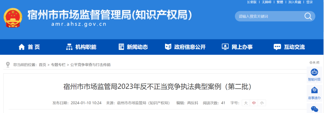 1月10日,安徽省宿州市市场监督管理局发布了一则关于《宿州市市场监管局2023年反不正当竞争执法典型案例(第二批)》的公告(下称《公告》)。