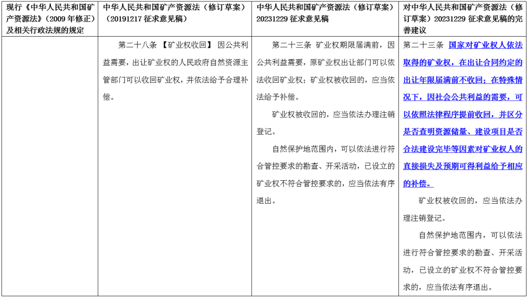 比较上述《海域使用管理法》《城市房地产管理法》及《民法典》的相关规定,建议将矿法修订草案第二十三条第一款由“矿业权期限届满前,因公共利益需要,原矿业权出让部门可以依法收回矿业权;矿业权被收回的,应当依法给予补偿”修改为“国家对矿业权人依法取得的矿业权,在出让合同约定的出让年限届满前不收回;在特殊情况下,因社会公共利益的需要,可以依照法律程序提前收回,并区分是否查明资源储量、建设项目是否合法建设完毕等因素对矿业权人的直接损失及预期可得利益给予相应的补偿。”