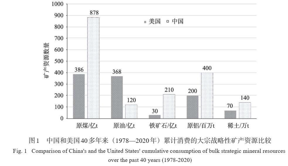 自然资源支撑了中国过去的快速经济发展,但现在及未来的资源需求模式发生了重大变革。据统计,过去40年中国和美国都消费了一些大宗战略性资源但差异明显(图1),美国除了原油的消费比中国高以外,其他大宗战略性资源的消费量都比中国低。过去40年,中国消费了约800亿t的原煤、120亿t原油、210亿t铁矿石、4亿t原铝和140万t的稀土。也就是说,中国除了原油的消耗比美国低以外,其他大宗战略性资源消耗都要比美国高2~7倍。由于大规模基础设施的建设,中国3年的水泥使用量超过美国100年的使用量。