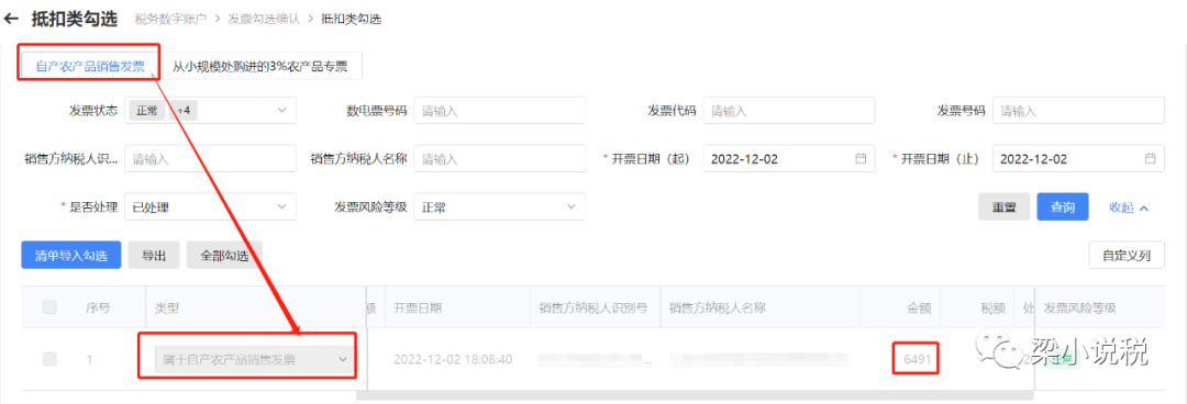 但销售方开具的发票必须带有"自产农产品销售"标签,如果不带这个标签,购买方无法在数字账户勾选抵扣,购买方压根查询不到这个所谓"农产品自产销售发票",无法勾选抵扣。重点提醒!重点提醒!重点提醒!