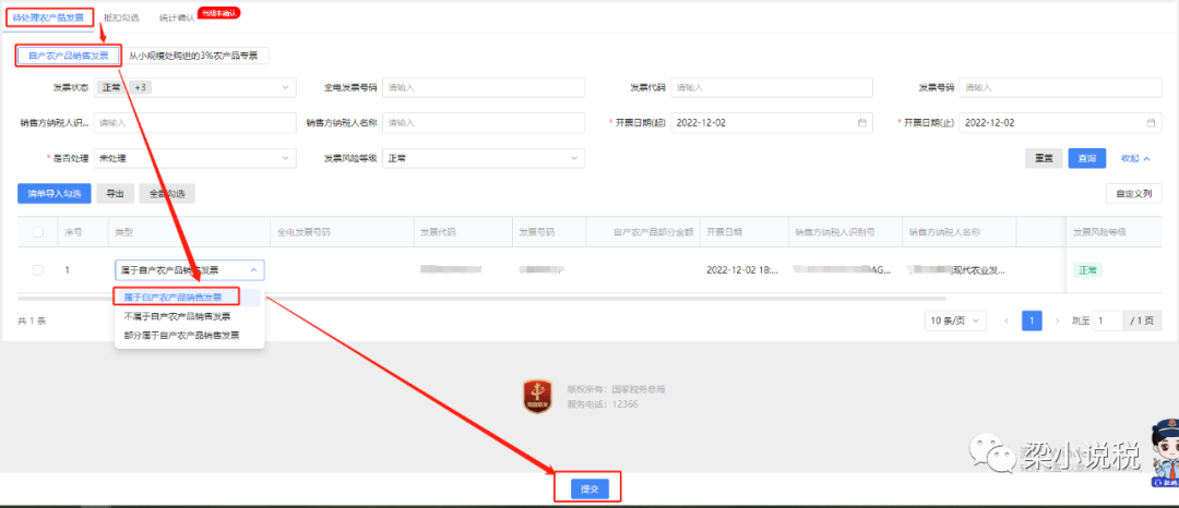 ①销售方必须向税务机关申请归类为「自产农产品者」,需要到办税大厅申请归类,由税务大厅人员在金三系统中通过「登记户归类」功能进行归类,当月归类,次月生效。