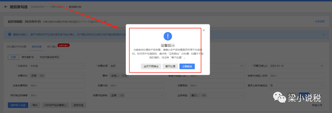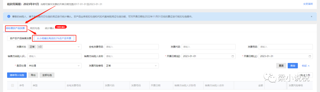 不管是税控开的3%专票(自开和代开)还是数电平台自开的3%专票,都需要购买方先在"待处理农产品发票模块"→“从小规模纳税人购进的3%农产品专票”模块处理,处理后与一般增值税专票勾选一样。