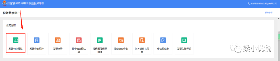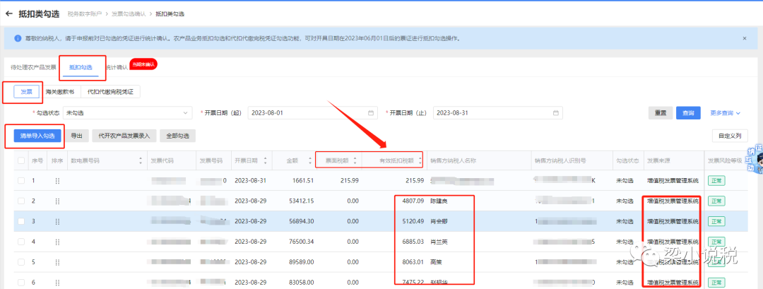 以上操作后,销售方开出的数电票左上角才会标注"自产农产品销售"标签,购买方才能在税务数字账户中勾选确认,不需要计算抵扣了,和一般增值税专用发票一样,勾选抵扣!