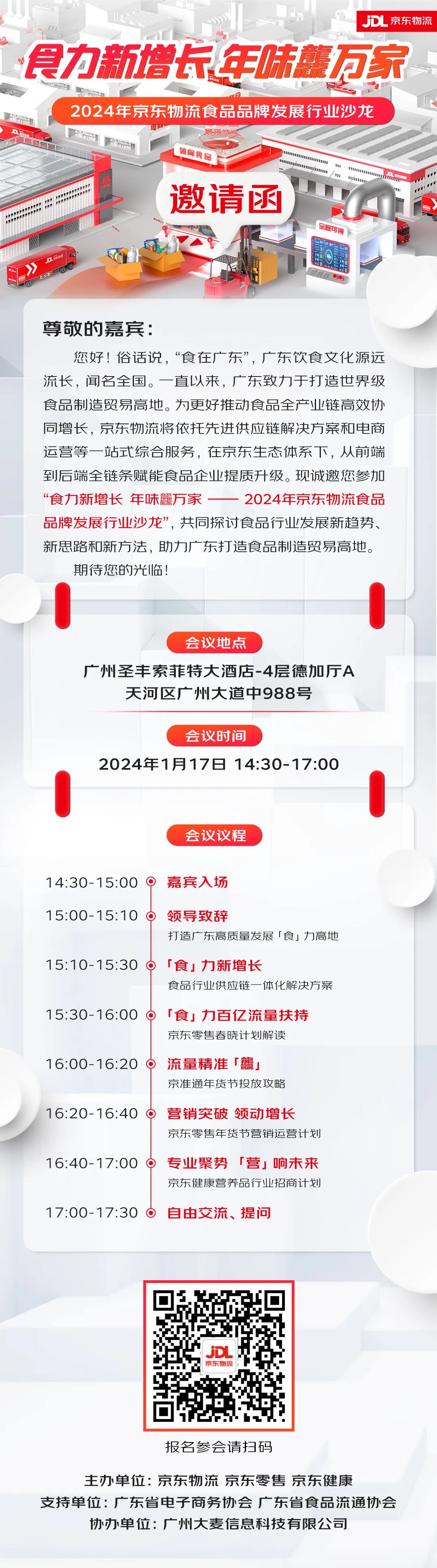 京东物流、京东零售、京东健康主办、我会支持的“食力新增长 年味龘万家——2024年京东物流食品品牌发展行业沙龙”,将于2024年1月17日在广州举办,诚挚邀请各商家朋友参加!