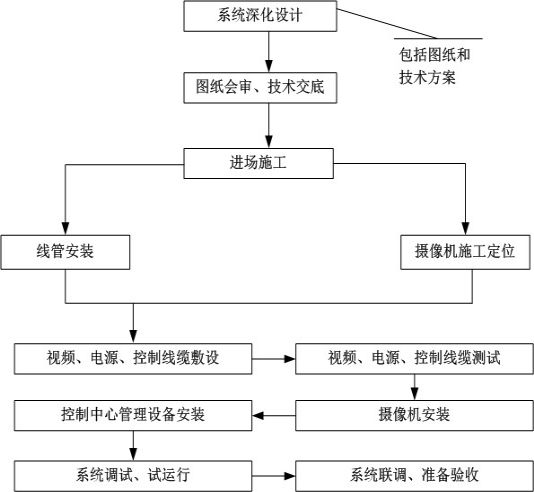 安全防范系统监控设备是建筑弱电系统中比较精密的光学、电子设备,而摄像机又是该系统中最精密的设备,必须在土建、装修、工程结束后,各专业设备安装基本完毕后,在安全、整洁的环境下方可安装摄像机。安装要点如下:安装前检查摄像机包装及配件,确认摄像机为全新原厂合格产品,说明书、合格证等齐全。每个摄像机均应通电进行检测和调整,处于正常工作状态的摄像机方可安装。摄像机连接线缆应留有至少1米的余量,不得利用线缆插头和电源插头来承载重量。安装位置的确定:摄像机宜安装在被监视目标附近且不易受到外界损坏的地方,安装位置不应影响附近现场人员的工作和正常活动。安装高度室内以2.6米—5米为宜,室外以3.5米—10米为宜。摄像机的镜头要避免强光直射,避免逆光安装,若必须逆光安装,应选择将监视区的光对比度控制在最低限度范围内。固定摄像机支架的安装要求:摄像机支架外型要美观,材质优良,不得有锈蚀现象,颜色和周边环境相协调,安装位置合理且垂直无偏差,采用胶塞或膨胀螺栓进行安装,线缆不外漏。摄像机电源的安装要求:室外摄像机电源需单独安装在防水电源箱内,周边应通风良好,牢固,防水,电源线良好的绝缘且套管保护,尽量就近隐蔽安装。室内采用集中供电方式,注意电源线接头连接牢固可靠,安装在电源装用箱内,每一路都提供安全保险管。网络智能球机的安装要求:网络智能球机防护罩要连接稳固,不得脱落,不得刮花,支架与球体连接牢固,支架与墙体或立杆连接必须牢固,以免脱落摔坏机器或砸伤行人。线缆的安装要求:双绞线打水晶头应符合B类线序工艺要求,电源线线头应焊锡处理连接到接线端子,同时检查摄像机相应的设置及线缆的编号标识是否完整。电视拼接墙监控中心设备如解码器、监视器、电视拼接墙、硬盘录像机等固定安装在电视拼接墙事先规划好的位置上,不许松动,设备之间留有适当间隔以通风散热和日常维护;各视网线、电源线牢固连接到相应接线端子,各线缆标识清楚正确,绑扎条理清晰美观。电视拼接墙监视器合理分布,安装美观,电视拼接墙安装在空间比较大的位置,有利于设备安装、运行和维护。电视拼接墙后侧留有1米的空间,供调试维护使用,控制台和电视拼接墙之间留有2米的空间,供日常工作使用。控制台设备如控制键盘等要求线缆的连接牢固、不松动,设备摆放合理,操作方便。监控中心安装UPS不间断电源,保证监控系统供电的稳定性,监控中心地面铺设静电地板,线缆均从地板下面空间进入电视拼接墙设备,所有设备良好接地。传输系统将监控系统的前端视频扑捉设备与监控中心终端控制及录像存储设备联系起来。将前端视频信号送至控制中心管理设备,并把控制中心的指令信号送到前端摄像机。传输线路主要分为有线和无线两种方式,本次工程主要采用有线方式,线缆为六类非屏蔽4对双绞线缆。本系统主要是对六类非屏蔽4对双绞线缆进行敷设,敷设线缆要合理安排,敷设时防止电缆之间及电缆与其他硬物体之间的摩擦,转弯处、穿墙体时注意不要刮破线缆外皮。合理安排管内穿线的数量,JDG20管穿1条线,JDG25管穿2条线。穿线时应使用专业工具穿管器引导顺利的穿入管道内,不应用力拉拽,以免变形,影响其电气性能。线缆两端应进行标识,避免混乱,电视拼接墙端线缆应预留足够的长度,一般为底部预留4米。电源为DC12V直流电源的电源线不能与视频线同管敷设,需单独布管,以免造成信号干扰。前端摄像机及其他配件、监控中心设备、控制台设备必须全部安装完毕,线路连接完毕;土建及装饰工程基本完工;现场具备良好的防潮、防腐、防尘性能,设备均良好接地处理;机房装修完毕,清理干净,空调、UPS配电正常运行。调试顺序分为设备调试或自检,单系统调试,系统联调。首先使用万用表、笔记本电脑等设备对线路和前端网络摄像机进行调试。每条线路都要进行通、断、短路测试并做记录标记。每个摄像机都要进行方位的合理调整及镜头焦距的合理选择。单项设备和单系统调试完毕后,就可进行系统联调。在系统联调时最重要的是供电电源的正确性,不能短路和断路。其次是信号线路的连接正确性,极性正确性,输入输出关系正确性。系统联调是也可以完成某些性能指标的再一步测试。首先开通系统电源,然后依次打开各监控设备,使系统进入工作状态。通过控制主机指定一台监视器,用键盘分别调出要测试的摄像机画面,按“五级损伤制评分分级”表和“主观评价项目”表测试图像质量;测试者到摄像机安装地点察看安装位置是否合理,测试镜头、防护罩、支架、云台的安装质量和接头牢固情况,红外灯是否工作正常。 | |