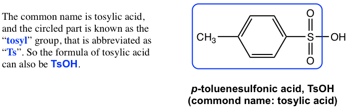 The replacement of one OH group in H2SO4 with a carbon-containing R (alkyl) or Ar (aromatic) group leads to the organic acid named “sulfonic acid” with the general formula of RSO3H, or ArSO3H. Sulfonic acid is a strong organic acid with a Ka in the range of 106. The structure of a specific sulfonic acid example called p-toluenesulfonic acid is shown here: