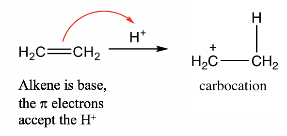 Alkene (C=C): Although there are no lone pair electrons in the C=C bond of alkene, the π electrons of the C=C double bond are able to accept protons and acts as a base. For example: