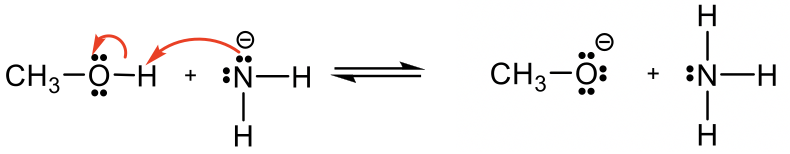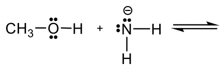 甲醇CH 3 OH 是中性的,另一个反应物NH 2 – 是带负电的酰胺。带负电荷的酰胺具有比中性甲醇更高的电子密度,因此酰胺 NH 2 – 应充当碱,CH 3 OH 为酸捐赠 H + 。