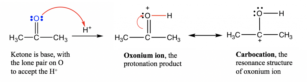 在这个酸碱反应中,酮被H + 质子化,所以这个反应也可以称为“酮的质子化”。The product of the protonation is called an “oxonium ion”, which is stabilized with another resonance structure, carbocation.