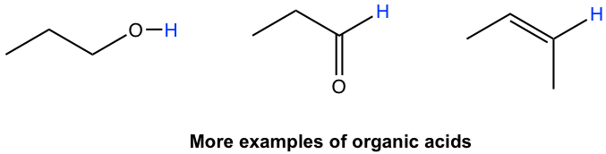 Other than the acids mentioned here, technically, any organic compound could be an acid because organic compounds always have hydrogen atoms that could potentially be donated as H+. A few examples are shown here with the hydrogen atoms highlighted in blue: