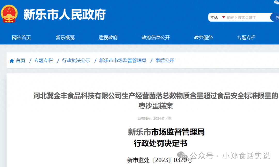 河北新乐市市场监督管理局近期对河北冀金丰食品科技有限公司生产销售不合格枣沙蛋糕依法作出罚款5万元并没收违法所得1155元的行政处罚, 行政处罚决定书内容摘要如下: