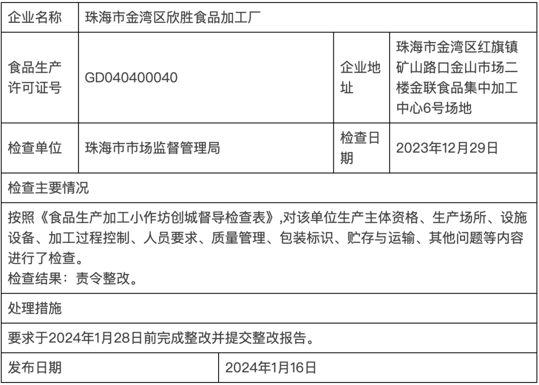 公布!金湾这家食品公司被责令整改 !