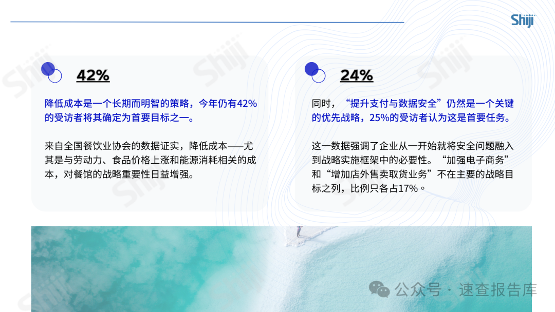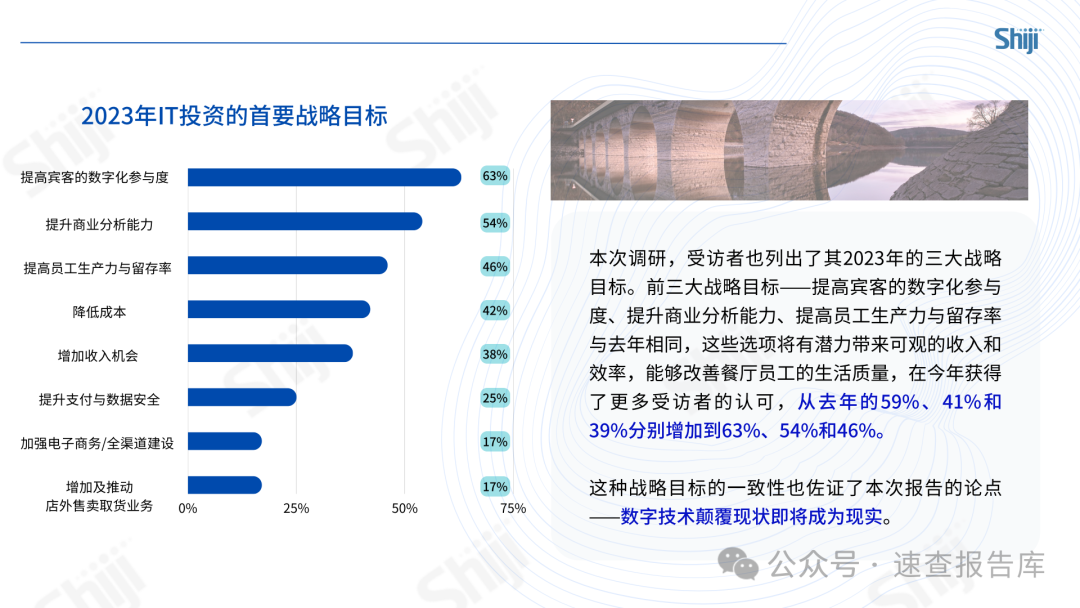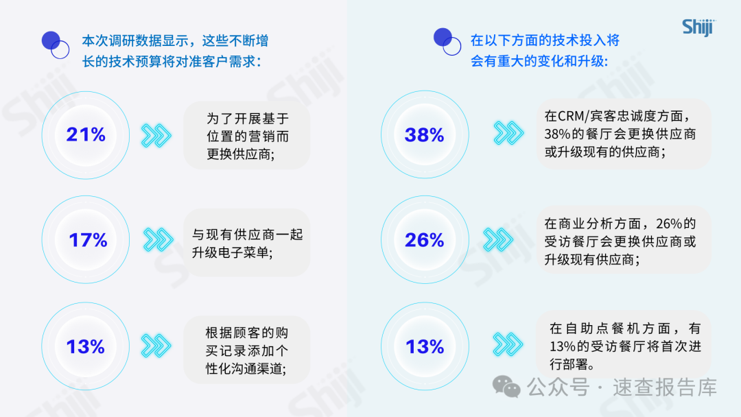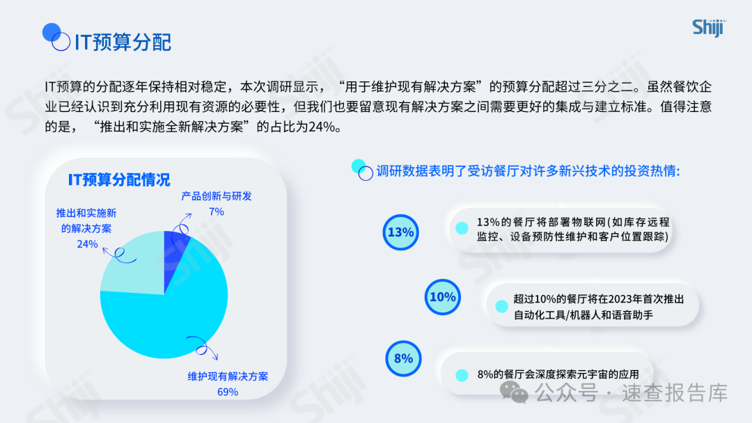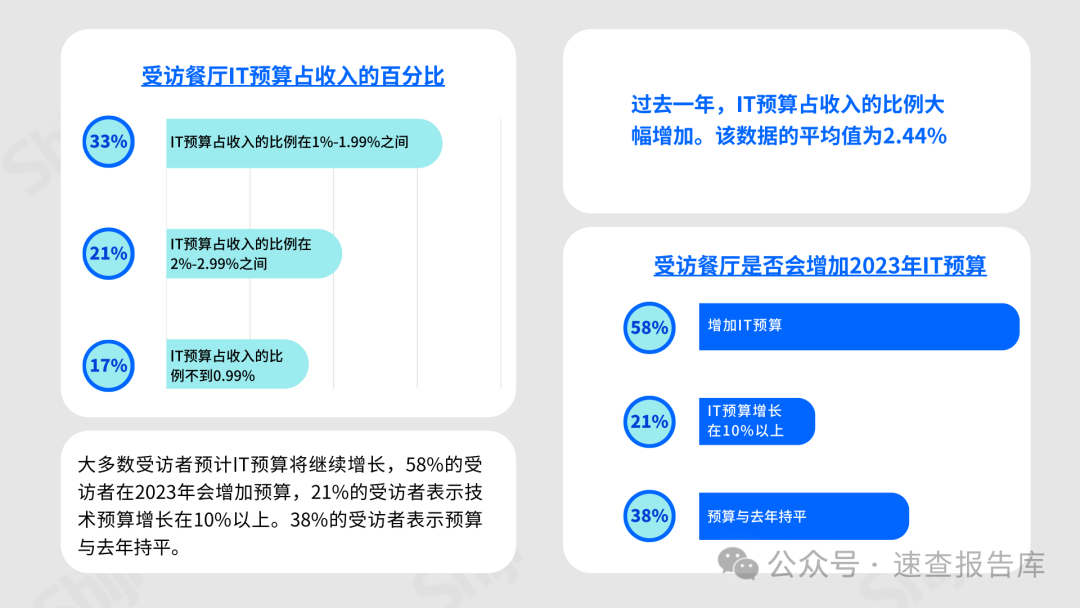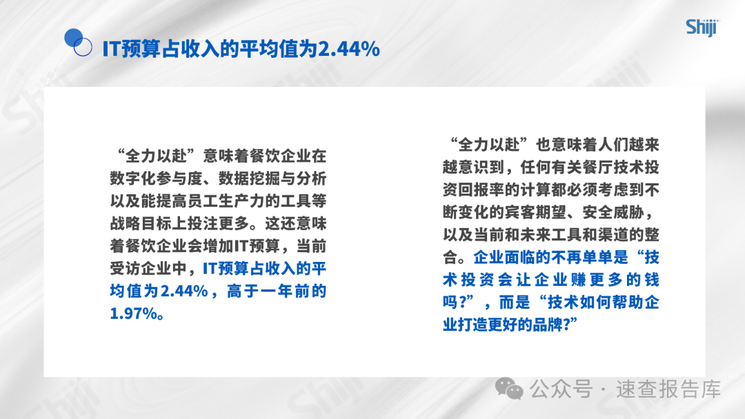 “全力以赴”意味着餐饮企业在数字化参与度、数据挖掘与分析以及能提高员工生产力的工具等战略目标上投注更多。这还意味着餐饮企业会增加IT预算,当前受访企业中,IT预算占收入的平均值为2.44%,高于一年前的1.97%。