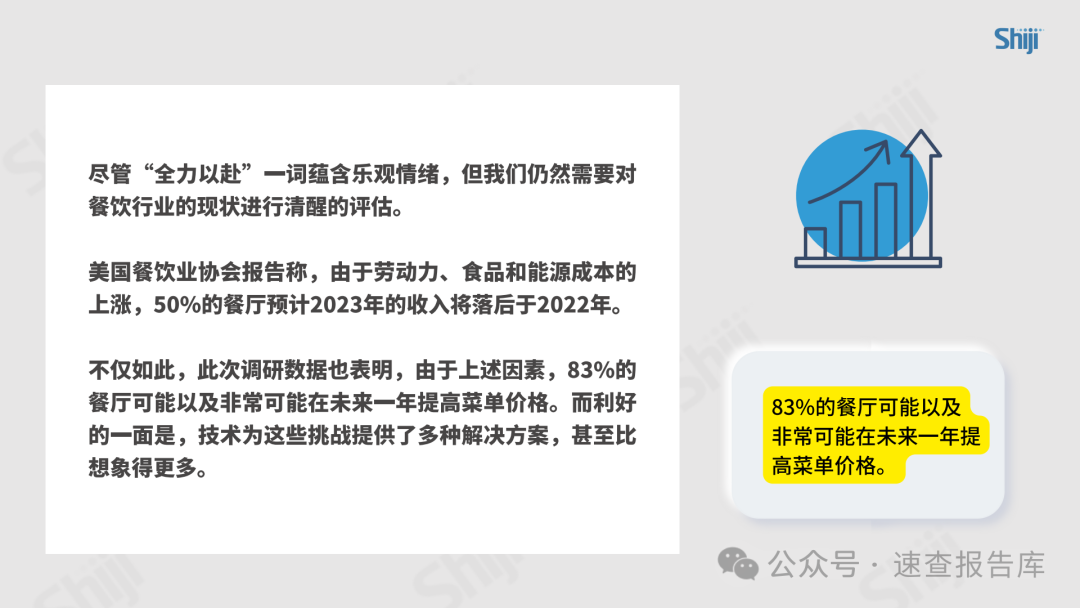 不仅如此,此次调研数据也表明,由于上述因素,83%的餐厅可能以及非常可能在未来一年提高菜单价格。而利好的一面是,技术为这些挑战提供了多种解决方案,甚至比想象得更多。