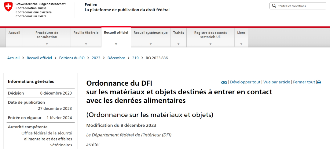 2023 年 12 月 8 日,瑞士颁布了《材料与物品法令- 817.023.21》的修正案,该修正案将于 2024 年 2 月 1 日正式生效。