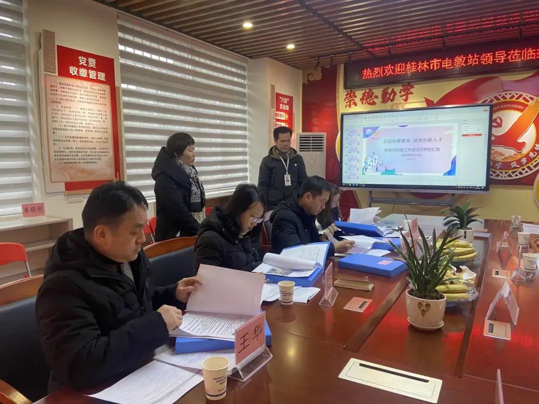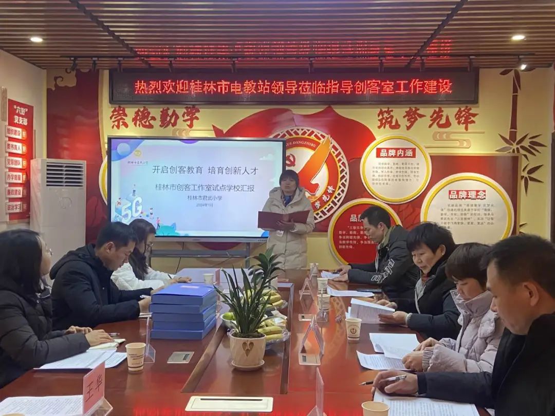 为发挥教育信息化示范引领带动作用,加快桂林市中小学创客教育全面发展,1月24日,桂林市电教仪器站副站长胡波一行4人到桂林市君武小学进行创客工作室试点学校现场评估,雁山区教育局莫玉艳局长亲临指导。