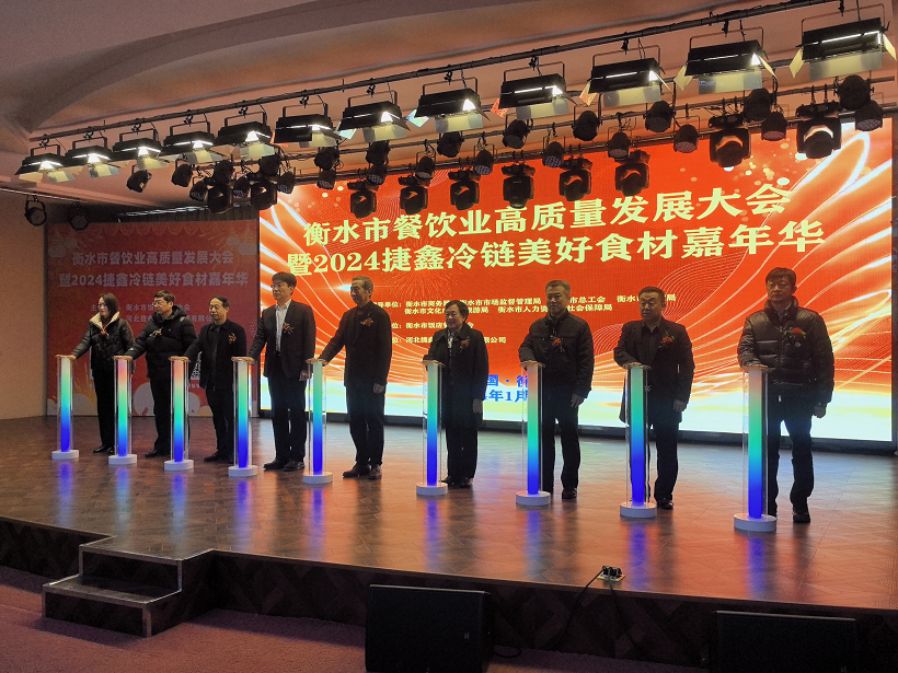 参会主要领导及嘉宾上台按亮启动柱,宣布衡水市餐饮业高质量发展大会暨2024捷鑫冷链美好食材嘉年华正式启动。