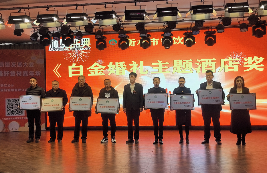 王局长为获得衡水市餐饮业领跑企业和白金婚礼主题酒店的获奖企业颁发奖牌并合影留念。