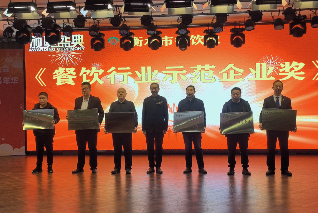 冯会长为获得衡水餐饮业示范企业和领军人物的获奖企业颁发奖牌并合影留念。
