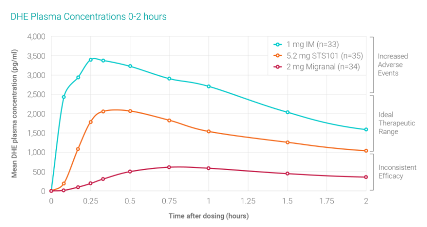 Satsuma 称与液体鼻喷雾剂制剂相比,STS101 的吸收速度更快,并且更快地达到峰值 DHE 血浆水平,转化为更好的疗效。