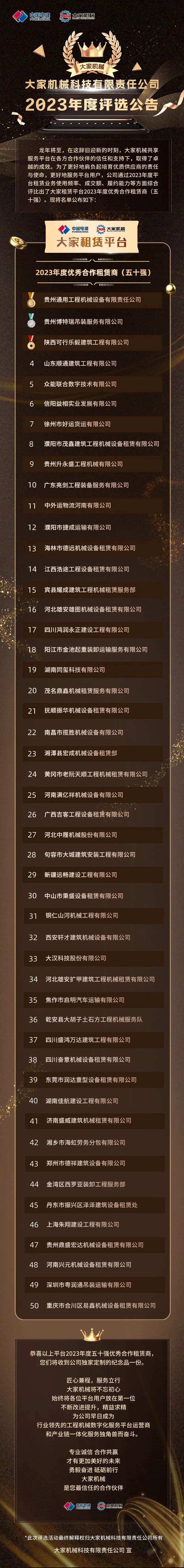 【重要公告】大家机械科技公司2023年度优秀合作租赁商(五十强)评选公告