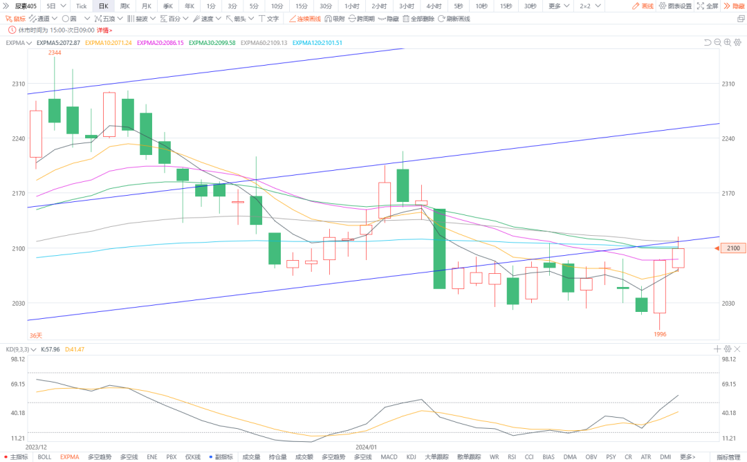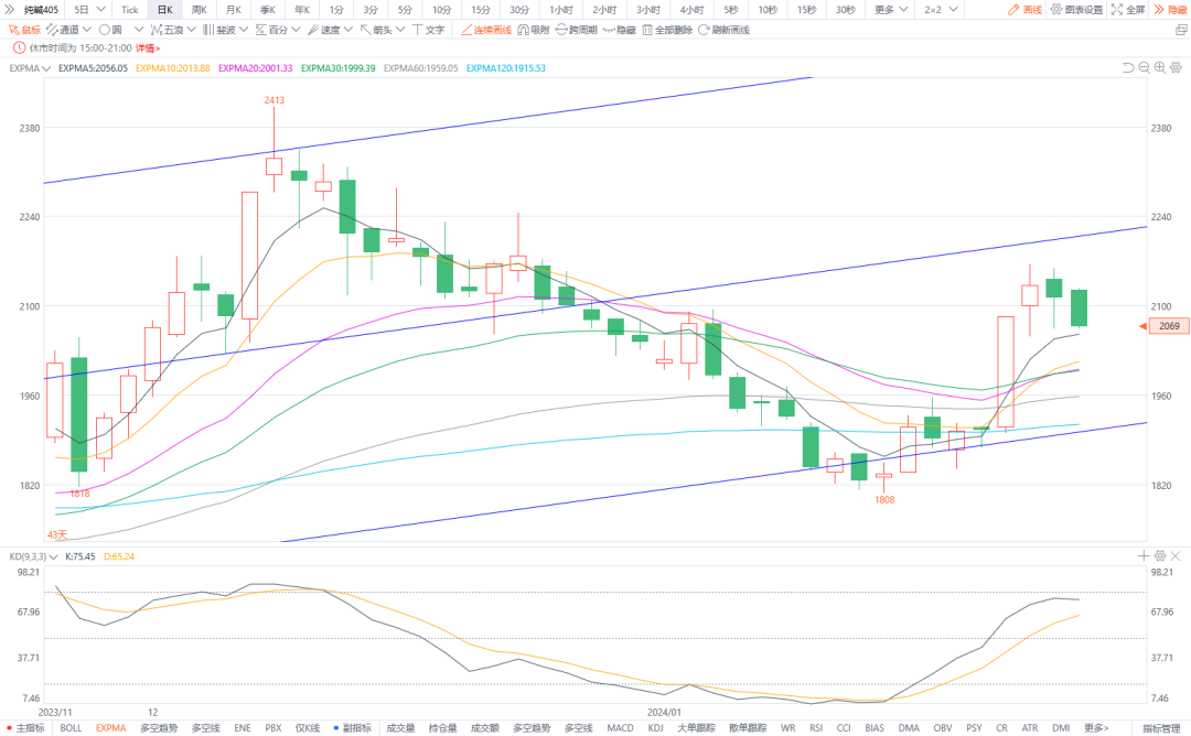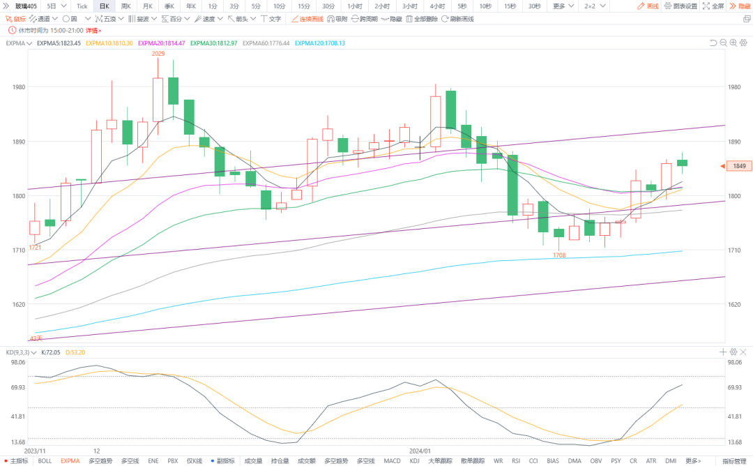 2.玻璃405:预计将震荡整理。今日浮法玻璃现货市场价格为2016元/吨。上游纯碱市场价格偏弱,玻璃企业利润上升,供应充足。春节假期临近,下游企业需求减弱,基本面未见明显利好。图形上,今日期货价格冲高1872后回落,高位窄幅震荡,下方均线粘合且尚存支撑,预计将持续震荡形态。节前建议观望或高位看空对待。