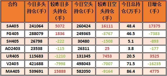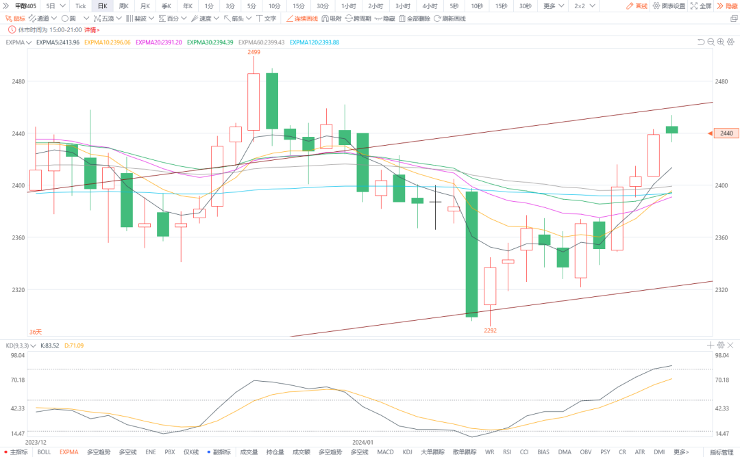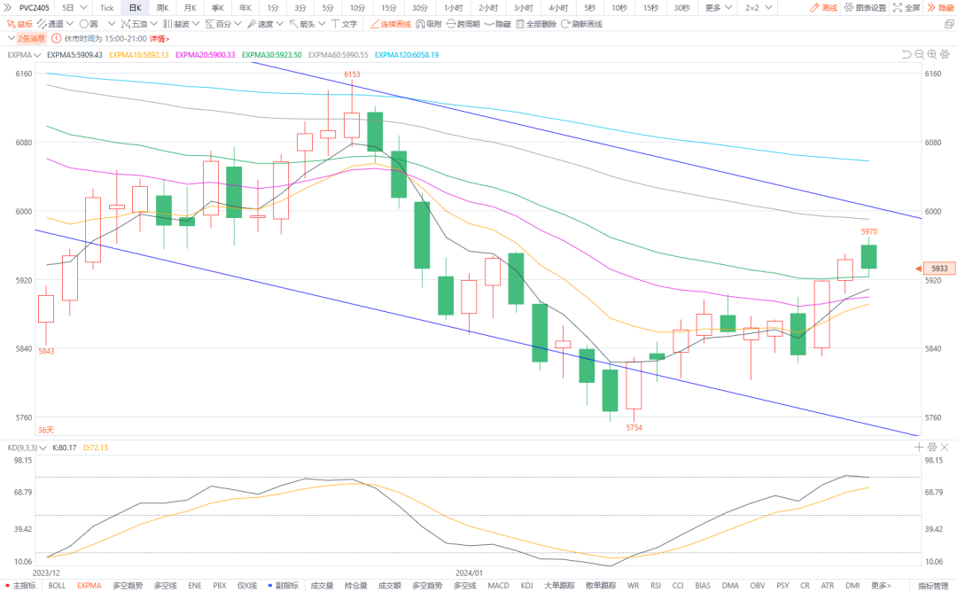 6.PVC2405:预计将震荡盘整。PVC现货供应充足,预计开工率将提升。临近春节,下游需求走弱,短期来看出口量难有大幅增长,行业库存持续累高。图形上,今日期货价格略有回调,K线下方接触30日均线支撑,上涨驱动一般,预计PVC期货价格提振有限,难有趋势行情。建议关注后续宏观政策影响,节前震荡看待,中期市场价格弱势看低。