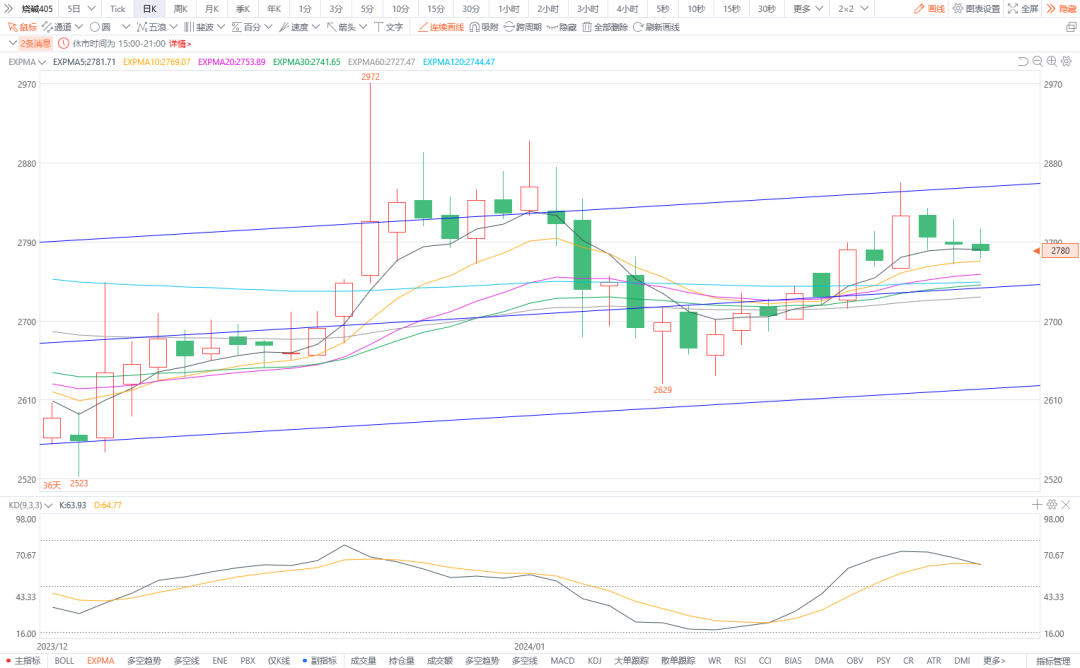 3.烧碱405:预计将偏弱震荡。供应端开工负荷相对稳定。铝土矿紧张的情况短时间内难以缓解,氧化铝短期内较难实现提产,难以对烧碱需求产生明显支撑。预期烧碱企业未来可能会降低生产负荷。图形上,今日价格窄幅震荡再次回落,空头排列大致形成,KD交叉粘合向下,顶部特征明显。预计烧碱期货价格将在通道内偏弱震荡,建议观望或轻仓试空。