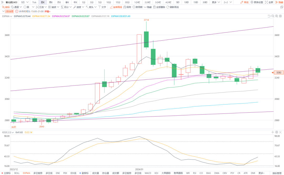 4.氧化铝2403:预计将震荡盘整。今日河南部分地区启动重污染天气黄色预警响应。某氧化铝厂因故计划从25日起停止一台焙烧炉生产。今日氧化铝北方地区均价3349元/吨。上游矿石紧缺问题依然存在。考虑到春节假期不断临近,下游备货需求仍存。图形方面,今日期货价格震荡区间持续收窄,预计短期持续震荡,建议观望或逢低短多。