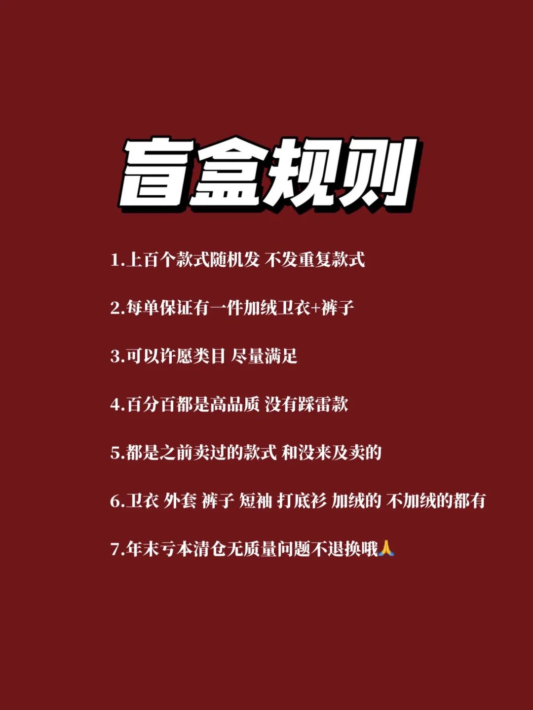 ?????? 盲盒内含?.? 每单必有一件加绒卫衣 每单必有一件潮牌衣服 每单必有上衣+裤子 每单随机到手3-5件 数量有限 先到先得 可以许愿类目 基本满足❗️