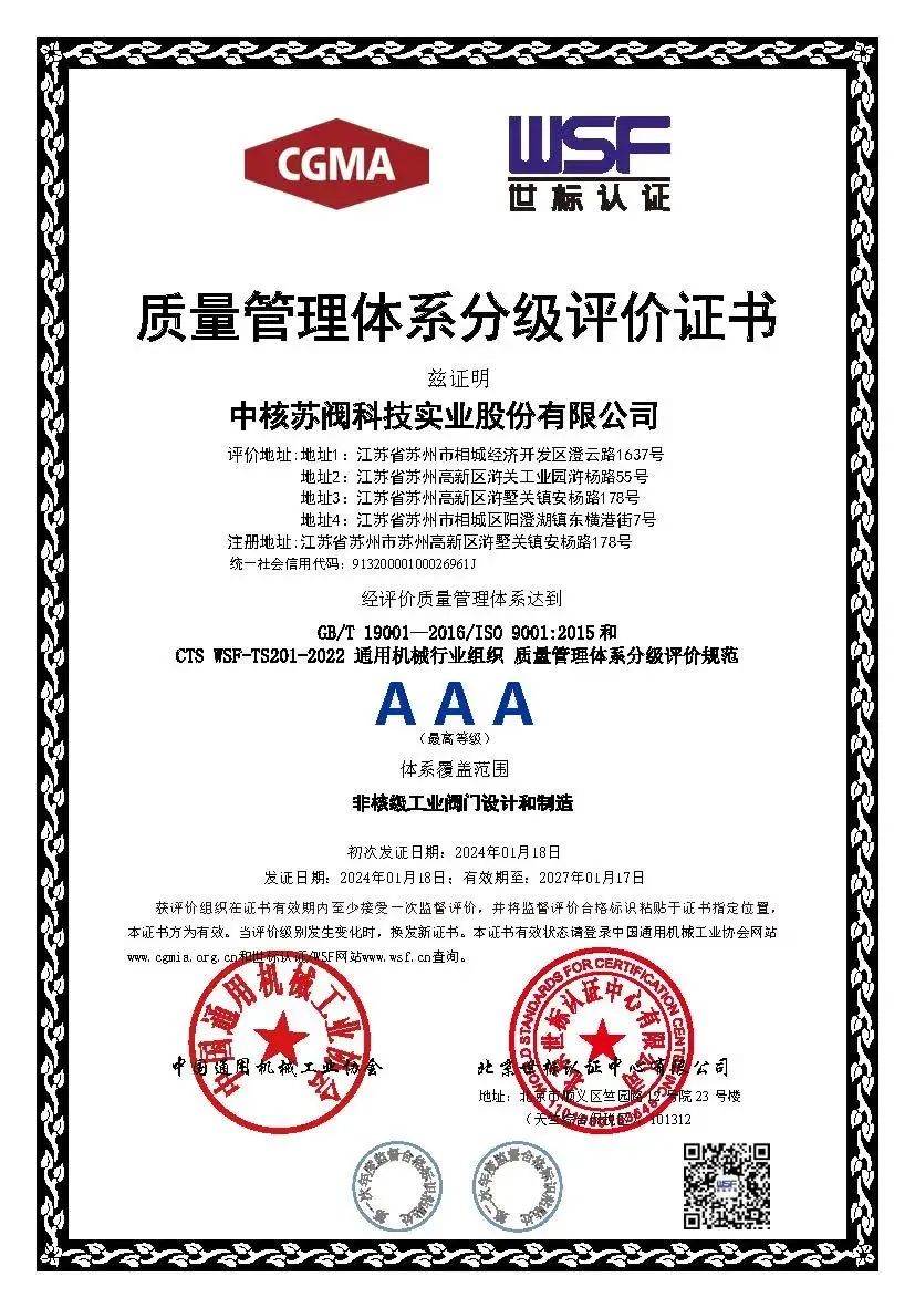 最终,审核组一致认为中核苏阀科技实业股份有限公司在质量管理方面的成熟程度达到AAA级卓越质量管理水平,质量管理体系运行非常成熟,管理成熟度在行业内处于卓越水平,质量绩效结果领先。