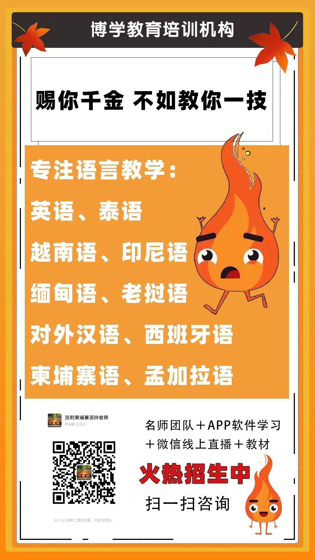 关于柬埔寨语学习,请大家扫描或识别以下二维码咨询,我们必将给您最好的服务。