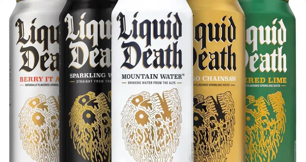 瓶装水品牌Liquid Death就是一个典型的反向营销品牌,除了力求通过提供铝罐替代品来消除世界上的一次性塑料水瓶外,他们的铝罐产品也与传统品牌截然不同。该品牌将重音乐、讽刺、艺术、荒诞幽默、喜剧小品等有趣的要素进行设计融合,罐身上充满了重金属、朋克等“重口味”视觉元素,包装底部还藏有一副相同风格的插画。如今,骷髅头已成为该品牌的标志性图案。
