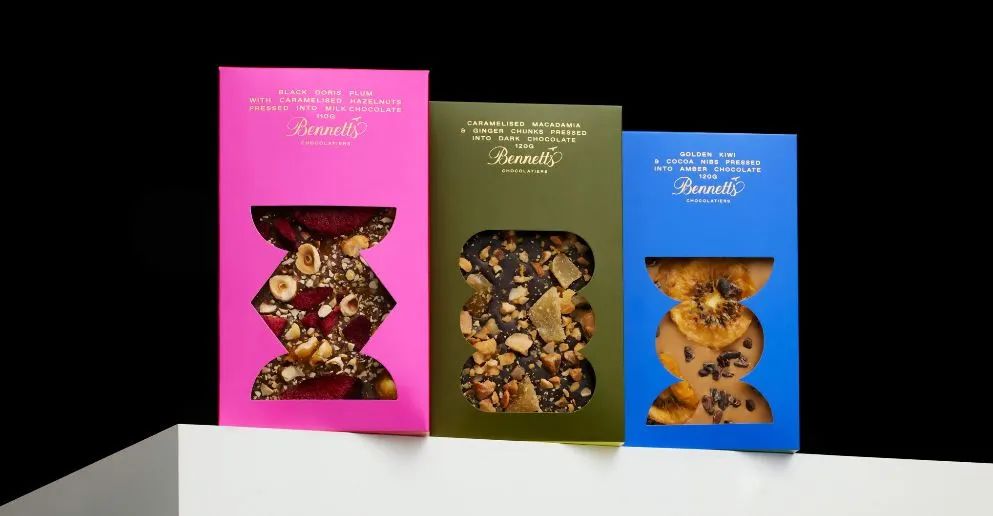 Bennetts Chocolatier是新西兰首屈一指的手工巧克力品牌,它的巧克力盒就靠着几何图案形成的视窗,成为甜点界精美视觉的代表。这些视窗不仅让消费者能看到产品内容物,还转变为动态的设计元素,使产品与视窗形状融为一体,互相衬托。