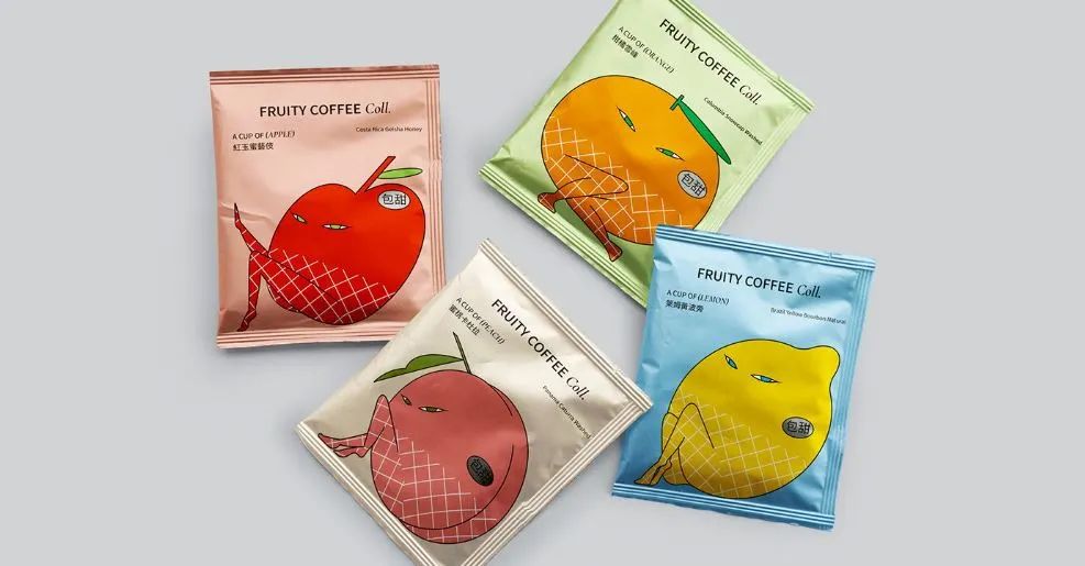除了上述设计类型外,还有一种最受品牌偏爱的一种形式——拟人化。通过为物体赋予人的性格,为受众带来一种俏皮与怪异并存的视觉感受,让人们忍不住将目光停留在上面。Fruity Coffee 系列包装就为果赋予了个性,通过将水果拟人化,展现出水果的甜美魅力。