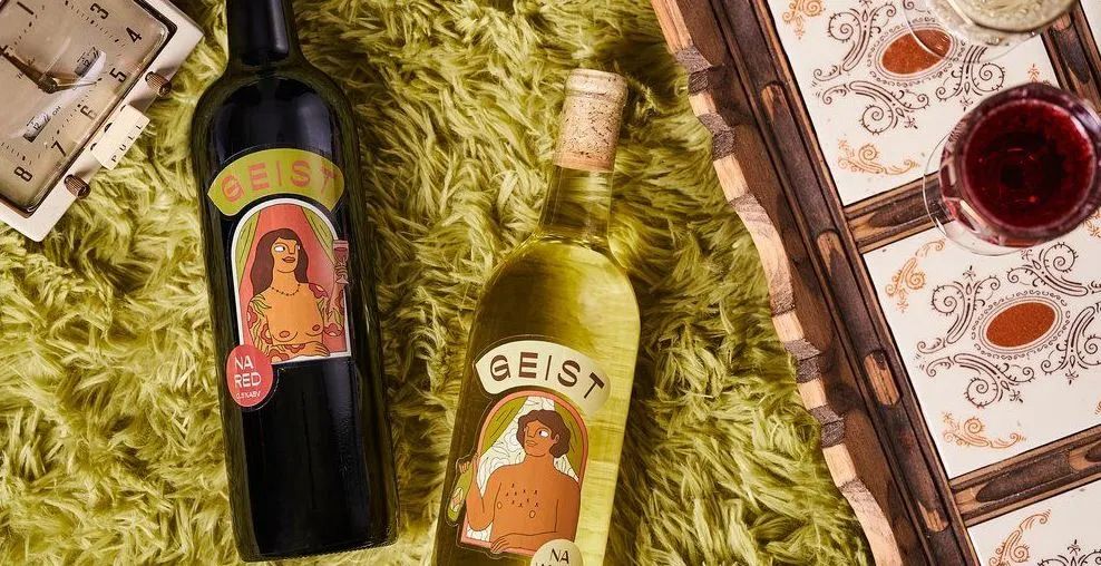非酒精葡萄酒品牌Geist Wine也在新产品的包装上通过怪诞的插画展现了这种审美风格,它在瓶身用蔑视世俗、颇具反叛意味的配图设计,搭配70年代的复古色调,强调了品牌打破常规的风格,也籍此向消费者证明俏皮和精致可以并存。