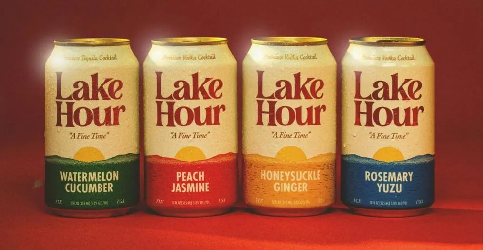 Lake Hour推出的2023年新啤酒包装就极具80年代风格。铝罐包装和谐地融合了上部的奶油色和底部的彩色,并配上品牌的标志粗衬线字体,充满年代美感。在此之上,借助底部不同色彩的展现,让包装与饮料的风味特征产生共鸣,完美体现出悠闲氛围。
