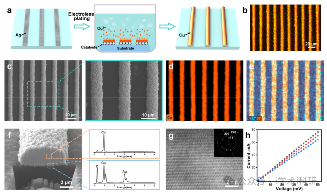 高分辨率电子制造技术是现代电子信息的基石,也是各种柔性电子器件和可穿戴设备的关键组成部分。传统的微电子制造技术通常依赖于长的减法制造工艺,尤其是复杂的光刻技术。要形成所需的印刷电路板(PCB),必须通过光刻形成微图案,然后进行化学蚀刻、金属电镀、抛光、清洗等工序,具体实验步骤多达几十步。化学蚀刻、抛光等减法工艺存在严重的材料浪费和环境污染问题。纳米粒子微电子学因其制备工艺简单、可扩展性强等特点而受到广泛关注,并已成为未来电子学的重要候选和/或先行者。基于导电油墨和/或浆料的流体印刷技术,如喷墨印刷、挤出印刷、丝网印刷等,在金属纳米粒子和微电子学之间架起了一座有效的桥梁。多年来,人们付出了巨大的努力,这些流体印刷策略在现代电子信息和各种柔性电子设备及可穿戴设备方面取得了突破性进展。然而,在小尺度(高分辨率) 上,各种流体效应,包括油墨/浆料与目标基底/模板之间的毛细现象、流体蒸发引起的咖啡环效应以及油墨/浆料的高粘度,都限制了高分辨率薄型微电子的制备。与传统印刷电路板相比,这些方法在有效分辨率方面仍面临挑战。虽然按需滴落印刷等技术具有相对较好的分辨率,但其低吞吐量和系统复杂性限制了其扩大生产规模和实际应用的可扩展性。自组装技术可通过各种弱相互作用将各种胶体纳米粒子集成到特定结构中,在光子晶体和表面增强拉曼等领域显示出极高的价值,特别是微结构诱导的蒸发自组装可实现高分辨率(<1 μm)纳米粒子微图案制备。印刷电子技术是柔性电子器件和可穿戴设备的关键组成部分,但实现高分辨率和高效率的兼容性仍然是一项重大挑战。在此,清华大学汪家道&马原教授团队提出了一种通过自组装和转移印刷快速制造高分辨率纳米粒子微电子的方法。构建了张力梯度-静电引力复合诱导的纳米粒子自组装策略,利用Marangoni效应和电双层效应显著提高了自组装效率、稳定性和覆盖率。紧密堆积的纳米粒子自组装层可在微结构表面大面积快速形成。受油墨印刷的启发,进一步提出了将自组装层转化为保形微图案的转移印刷策略。大面积、高分辨率 (2 μm)和超薄 (1 μm)的纳米粒子微电子可以稳定地制造出来,与流体打印方法相比有了显著的改进。纳米粒子微电子学独特的可变形性、可恢复性和可扩展性得到了揭示,为各种学术和实际应用提供了大有可为的机会。相关研究以“Rapid Fabrication of High-Resolution Flexible Electronics via Nanoparticle Self-Assembly and Transfer Printing”为题发表在Nano Letters期刊上。Figure 1. Schematic, mechanism, and characterization of the tension gradient−electrostatic attraction-induced silver colloidal nanoparticle self-assembly strategy.Figure 2. Schematic and characterization of the nanoparticle micropattern preparation via self-assembly and a transfer printing strategy.Figure 3. Schematic and characterization of the electroless plating based on the nanoparticle micropattern.Figure 4. Demonstration and characterization of the nanoparticle microelectronics.Figure 5. Demonstration and characterization of the recoverability of the nanoparticle microelectronic.总之,作者提出了一种通过纳米粒子自组装和转移印刷实现高分辨率柔性电子器件的快速制造方法。我们构建了张力梯度-静电引力复合诱导自组装策略,可在大规模(数百平方厘米)上快速形成紧密堆积的金属纳米粒子自组装结构。此外,还提出了基于固体界面能的保形转移印刷方法,用于在目标基底上将自组装层转化为纳米粒子微图案。采用这种方法可以快速大规模地制备高分辨率(2 μm)和超薄 (1 μm)微图案。实验进一步证明,纳米粒子微图案可作为前驱体,与无电解电镀相结合,形成高导电性铜箔微电路,而无需任何化学蚀刻工艺,这为以环保方式制备印刷电路板提供了充分的可能性。此外,纳米粒子微电路独特的可变形性和可恢复性也得到了揭示和验证。纳米粒子材料的可变形性与结构的可变形性相结合,实现了优势的叠加。这种高效、高分辨率、直接、环保的纳米粒子自组装和转移印制方法为微电子、柔性电子和柔性传感器等应用提供了广阔的前景。Rapid Fabrication of High-Resolution Flexible Electronics via Nanoparticle Self-Assembly and Transfer Printinghttps://doi.org/10.1021/acs.nanolett.3c04316*本文来源:作者团队,感谢作者团队对本公众号的大力支持!