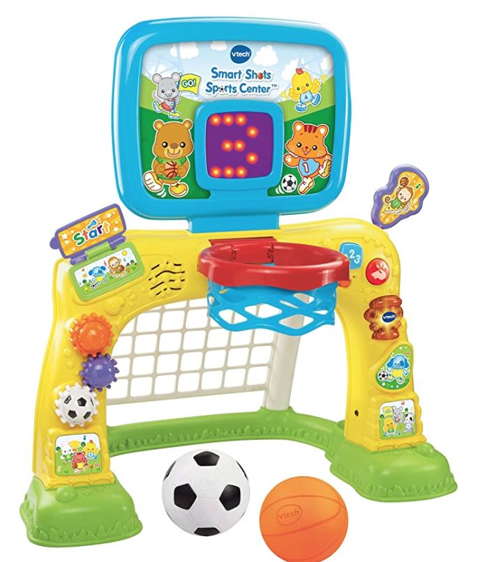 Amazon上超过4000+的好评,有投篮+足球两种玩法,1到3岁的小娃就能玩,还可以给娃计分,还能播放音乐和特定的音效。