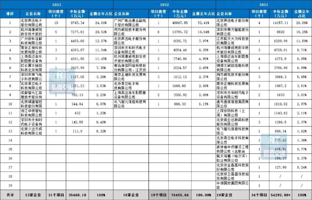 4、为统计需要,对某些未找到中标金额的项目进行了必要的市场估值(安防估算标准为每公里20万元左右进行测算,),并以“*”标注,中标金额精确到小数点后两位。另外,本次数据统计涉及联合体中标的项目,中标金额统一纳入牵头方或第一中标人的业绩中。