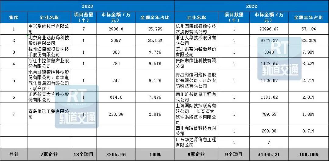 纵观2023年城市轨道交通安防系统中标市场,从中标企业来看,对比2022年,2023年城轨市场安防系统中标企业减少了2家。从中标总金额来看,2023年城轨市场安防系统中标总额相比 2022 年,呈现大幅下跌,由41965.21万元跌至8205.96万元。